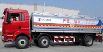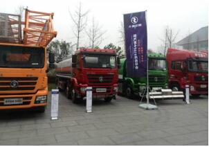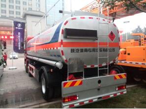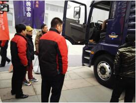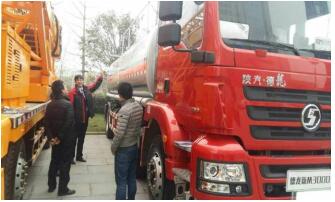 陜汽淮南公司技術人員現場向顧客介紹產品信息 經銷商、客戶等圍觀、試乘產品  陜汽淮南公司特別研制的易燃液體罐式運輸車