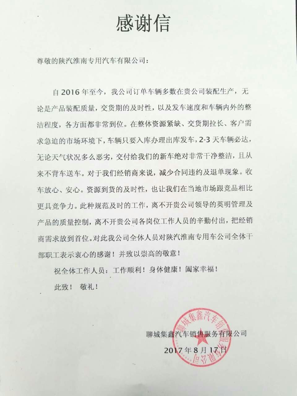 對話市場、服務客戶,是什么架接起彼此信任的橋梁?是將心比心的品質保證,是急客戶之所急的高效服務,更是數年如一日的風雨堅持。8月17日,一封來自聊城集鑫汽車銷售服務有限公司的特別感謝信,給陜汽淮南公司各級干部職工帶來了前所未有的振奮與鼓舞。300余字的信件,言簡意賅卻飽含深情地表達了對陜汽淮南公司鑄造精品的稱贊,對全體職工專業敬業的真誠感謝。 “無論是產品裝配質量,交貨期的及時性,以及發車速度和車輛內外的整潔程度,各方面都非常到位”,客戶真誠點贊的背后,是各部門緊踩節奏、環環相扣的高效協作。 訂單下達的第一時間,BOM制作、計調采購、倉儲管理、生產調度等一系列上線準備工作即刻聯動開展。為第一時間下發工藝BOM、輸出物料清單,技術部門委派專人對接集團,區別緊急訂單提前制定排產計劃;為確保關鍵資源及時供應,尤其是高產期風險資源儲備,陜汽淮南公司堅持實行預警及異常處理機制,結合生產節拍實時儲備安全庫存,實現底盤外購資源保障率在99%以上;為確保高產期流水作業裝配質量,工藝、質量、裝配人員實行創造性結對配組,隨線跟蹤風險隱患,嚴格踐行“三檢三不”工作法,截至7月末,今年平均生產周期13.35天,二季度按期交貨率100%,整車一次交驗合格率月度峰值達97.88%,上半年底盤過程審核率更是位居同類子公司第一。 “車輛只要入庫辦理出庫發車,2-3天車輛必達”、“交付給我們的新車絕對干凈整潔”、“到貨的及時性,讓我們在市場上更具競爭力”,滿足客戶的需求就是要跑贏一場與時間、細節的賽跑。 車輛出庫手續確認,整車合格證、電子標簽等證件辦理,車輛下線的同時,只有四個人的西安辦事處就馬不停蹄開始另一場接力賽跑。針對有提前、緊急交貨需求的客戶,時間往往異常緊張,面對焦急等待的客戶,周末加班辦理成為必須。與此同時,為保障送車安全與高效,陜汽淮南公司嚴格依照《產品交付控制程序》管控送車業務,并利用整車銷售信息管理系統和天行健平臺,實時監控在途車輛行駛狀態,充分發揮地處華東中心的地理優勢,確保900公里內產品24小時交付的高效送車。產品交付前,陜汽淮南公司還委派專人對車輛進行細致檢查與全面精整,確保車輛干凈整潔,讓客戶安心收車、舒心駕乘。 客戶永遠是最好的檢驗師,他們用一封信道出了一個真理:要想干出實績、干出形象、干出口碑,唯有踏踏實實的干、專業較真的干、高效協作的干,才能收獲經久不息的掌聲和歷久彌新的認可。堅守“客戶中心”發展初心,擦亮“干”字底色,陜汽淮南公司全員將慎終如始,繼續用過硬的產品和服務爭做客戶心中的“免檢品牌”。